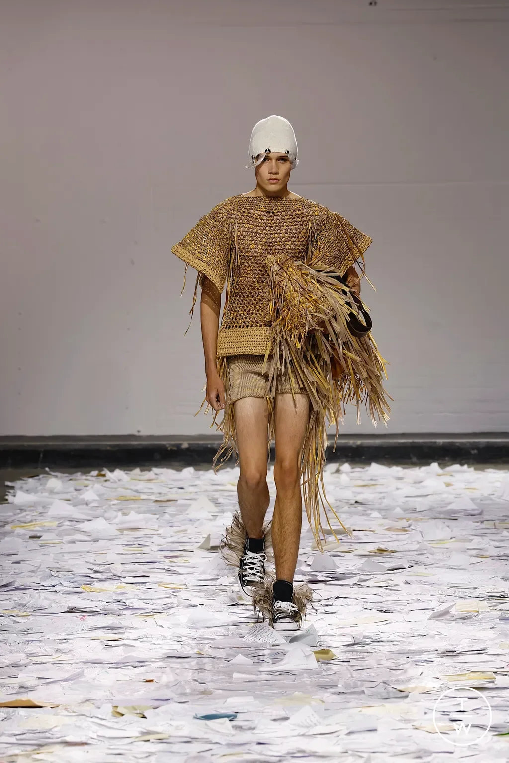 Opening in the NewGen space, Oscar Ouyang made his runway debut with a knitwear-inflected collection inspired by messenger birds—owls, doves, eagles—and the notion of lost letters. His work felt like a poetic overture: delicate textures, soft edges, and a narrative sense of communication across distance.