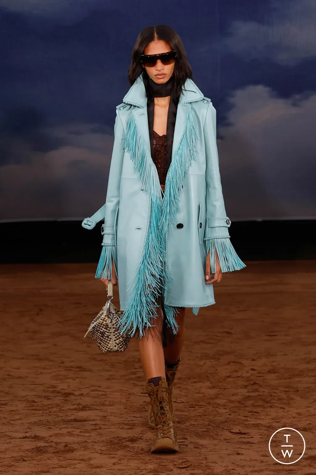 Burberry closed the week with one of its grandest spectacles. In Kensington Palace Gardens beneath a sky-printed tent roof, Lee fused rock-inspired energy, festival spirit, and British sartorial codes. Shorter-length trenches, sequinned shifts, bold leather tailoring, and fringed embellishments evoked a modern picnic-meets-punk.