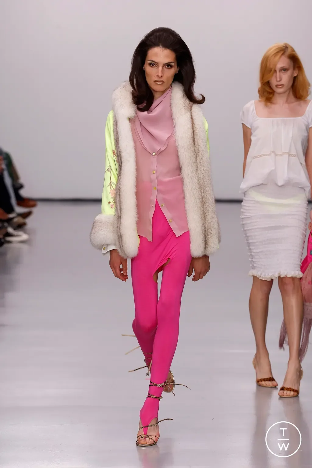 Chopova Lowena staged a spirited tribute to Americana and performance culture inside a repurposed church-gym space, weaving together cheerleading references, collage, and outsider aesthetics. Their collection embodied London’s edge—unpolished, bold, hybrid. The designers framed their vision around the tension between blending in and standing out.